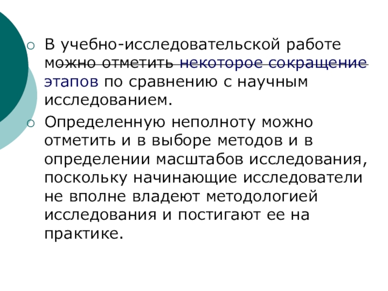 объясняется недостаточной самостоятельностью начинающих исследователей и обучающей задачей учебно-исследовательской работы