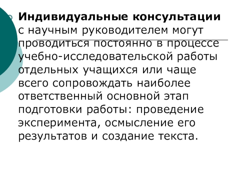 Слайд 27Индивидуальные консультации с научным руководителем могут проводиться постоянно в процессе