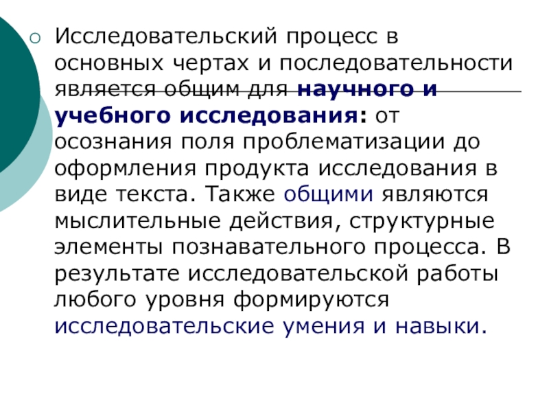 в виде текста. Также общими являются мыслительные действия, структурные элементы познавательного процесса. В результате исследовательской работы любого уровня формируются исследовательские умения и навыки.