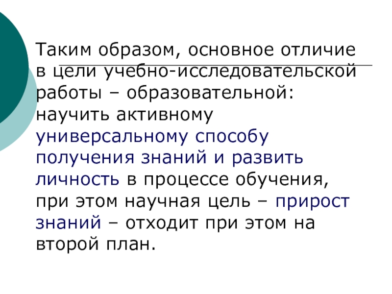 Таким образом, основное отличие в цели учебно-исследовательской работы – образовательной: