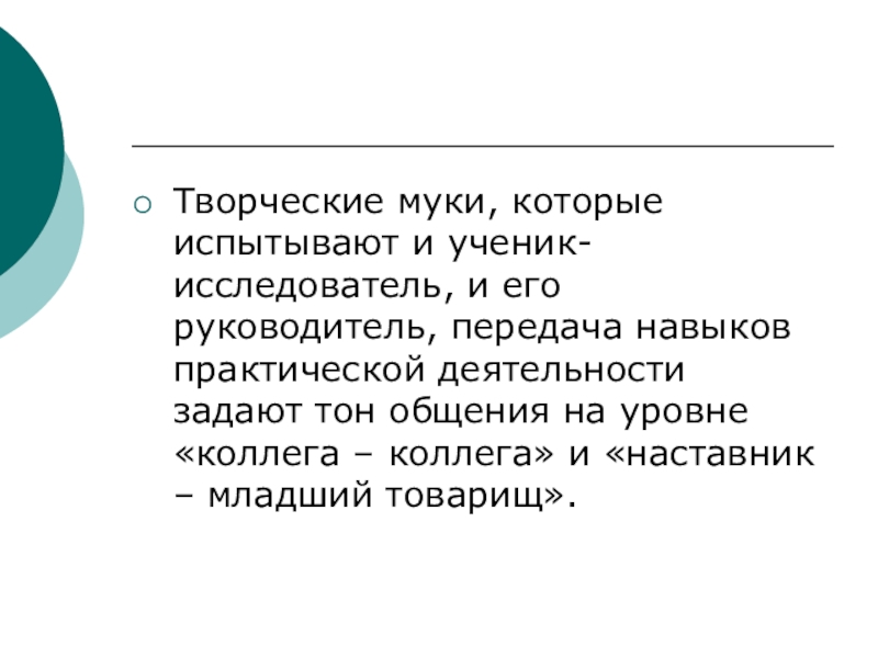 Слайд 30Творческие муки, которые испытывают и ученик-исследователь, и его руководитель, передача
