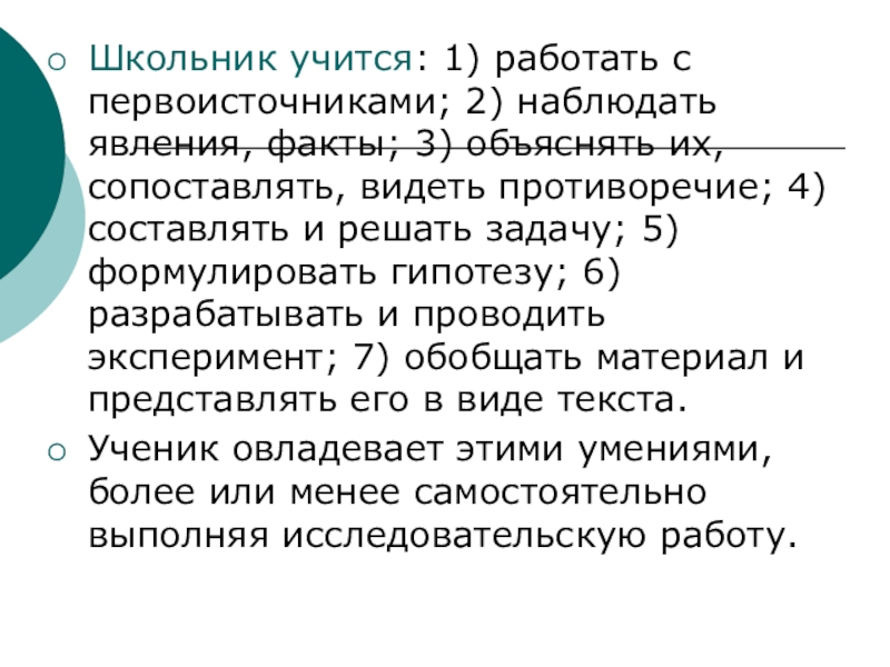Ученик овладевает этими умениями, более или менее самостоятельно выполняя исследовательскую работу.