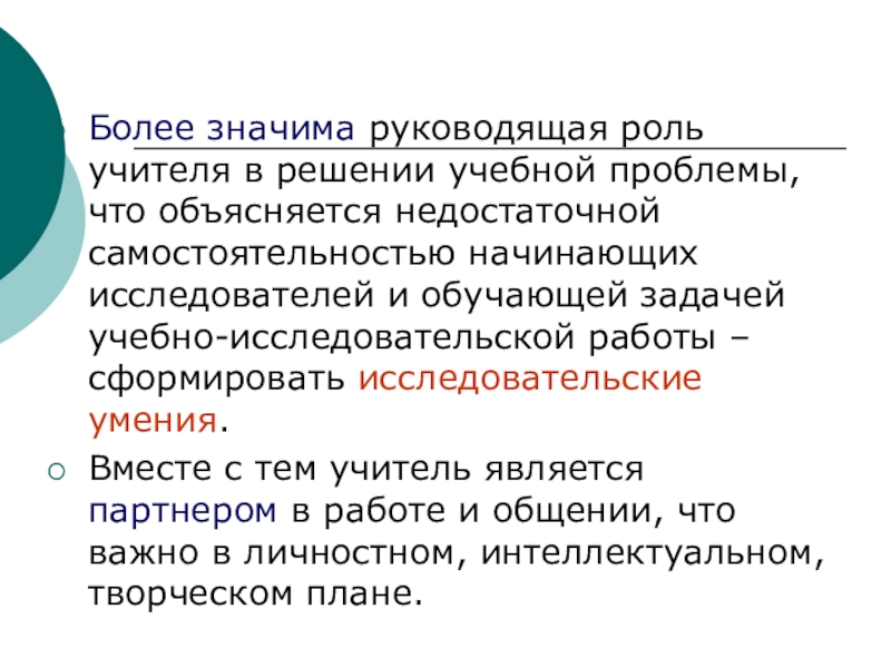 Слайд 20Более значима руководящая роль учителя в решении учебной проблемы, что
