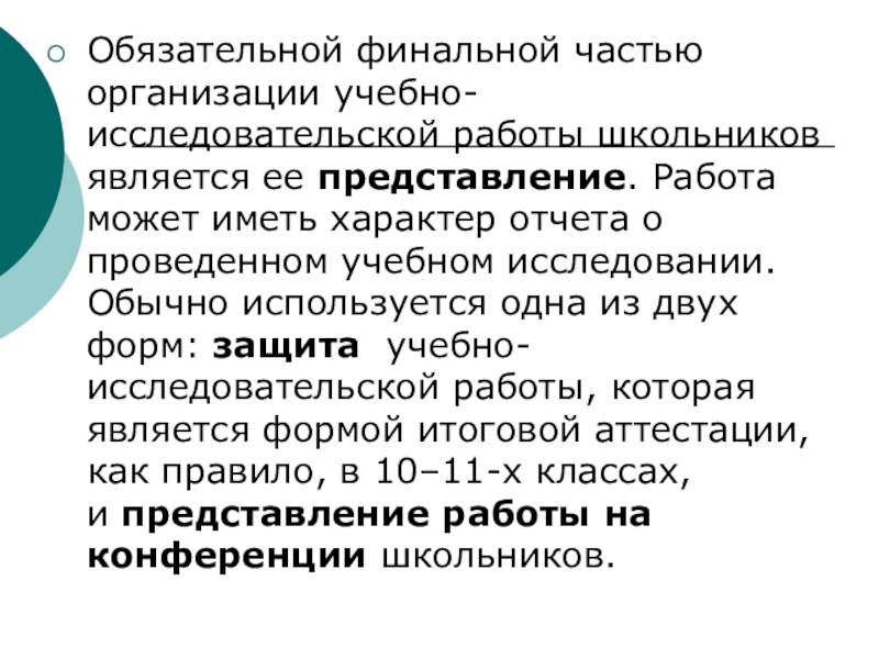 Слайд 31Обязательной финальной частью организации учебно-исследовательской работы школьников является ее представление. Работа