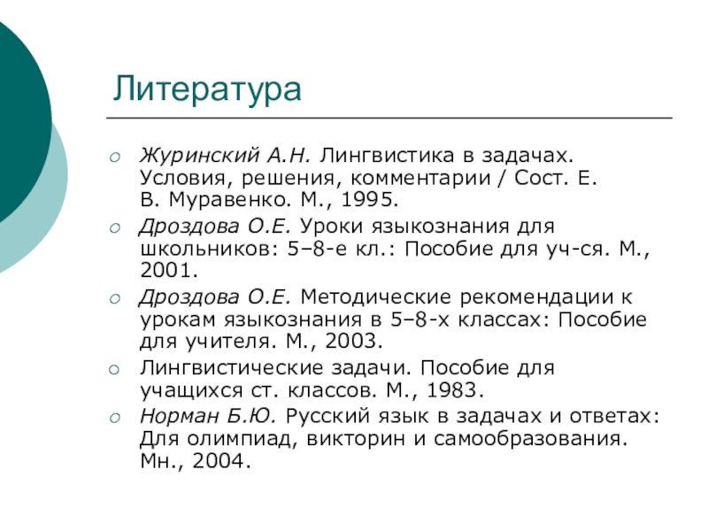 Дроздова О.Е. Методические рекомендации к урокам языкознания в 5–8-х классах: Пособие для учителя. М., 2003.