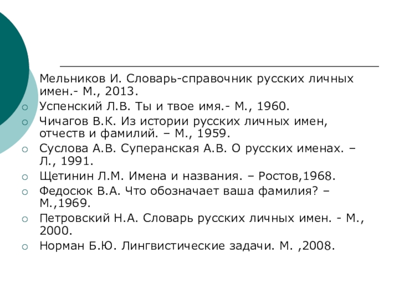 Слайд 33Мельников И. Словарь-справочник русских личных имен.- М., 2013.