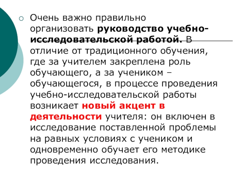 Слайд 28Очень важно правильно организовать руководство учебно-исследовательской работой. В отличие от традиционного обучения,