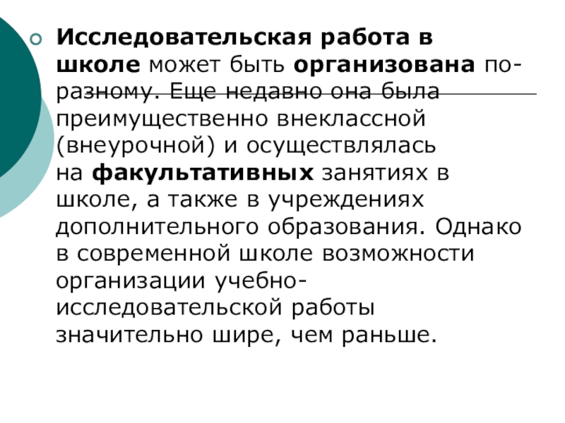 в учреждениях дополнительного образования. Однако в современной школе возможности организации учебно-исследовательской работы значительно шире, чем раньше.