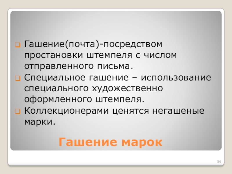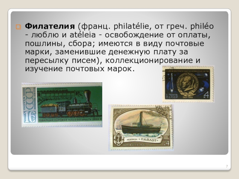 заменившие денежную плату за пересылку писем), коллекционирование и изучение почтовых марок.