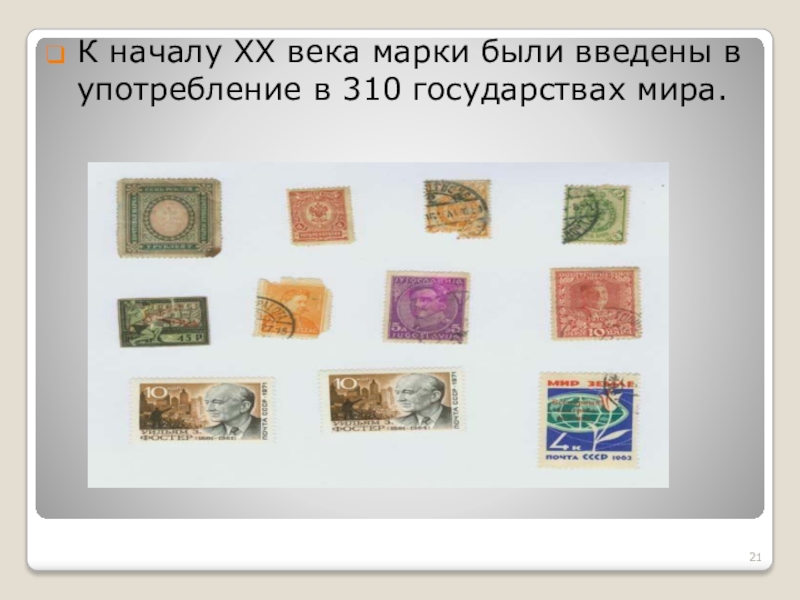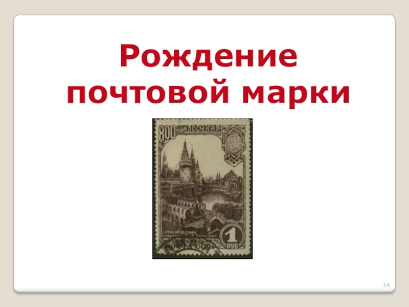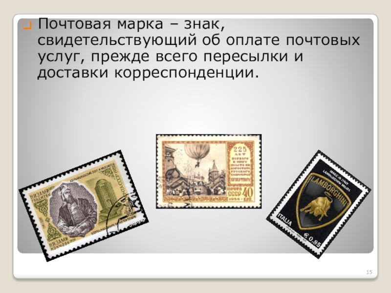 Слайд 15Почтовая марка – знак, свидетельствующий об оплате почтовых услуг, прежде