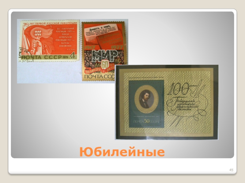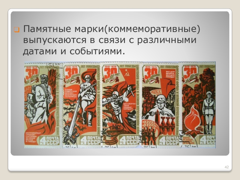 Слайд 42Памятные марки(коммеморативные) выпускаются в связи с различными датами и событиями.