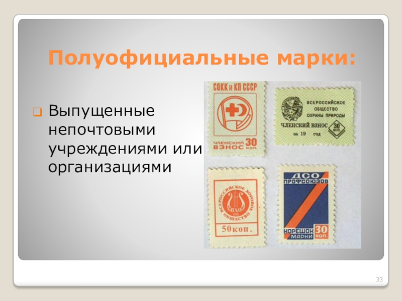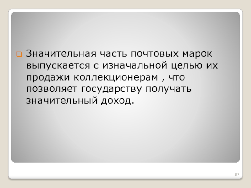 Слайд 57Значительная часть почтовых марок выпускается с изначальной целью их продажи