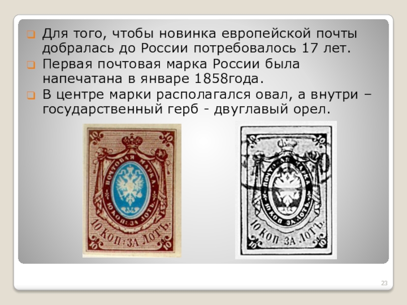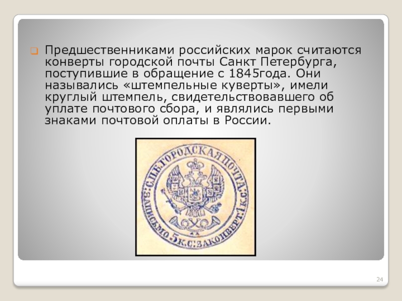 Слайд 24Предшественниками российских марок считаются конверты городской почты Санкт Петербурга, поступившие
