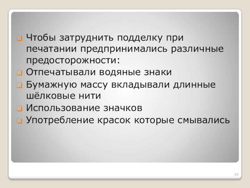 Слайд 39Чтобы затруднить подделку при печатании предпринимались различные предосторожности: