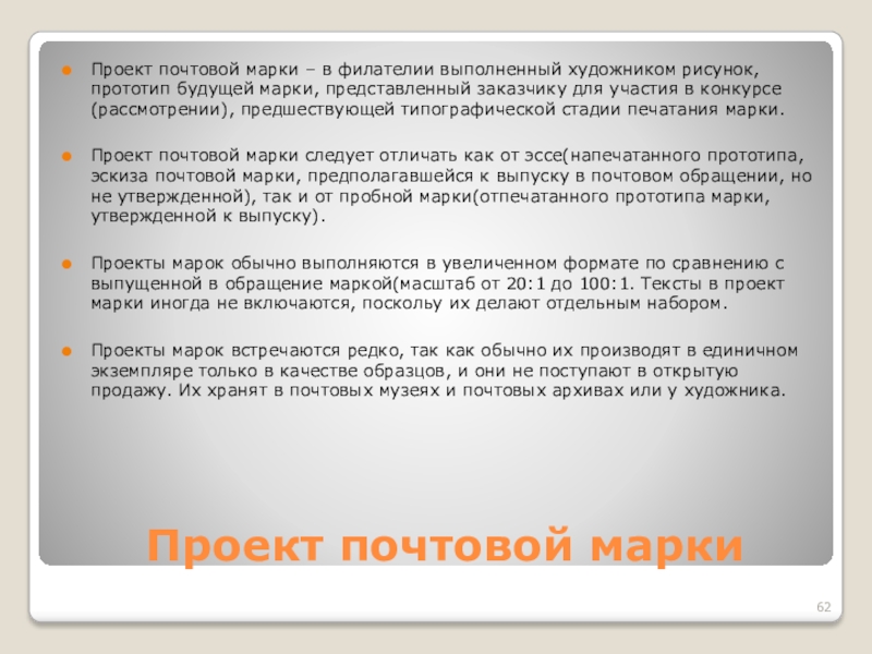 Проекты марок обычно выполняются в увеличенном формате по сравнению с выпущенной в обращение маркой(масштаб от 20:1 до 100:1. Тексты в проект марки иногда не включаются, поскольу их делают отдельным набором.