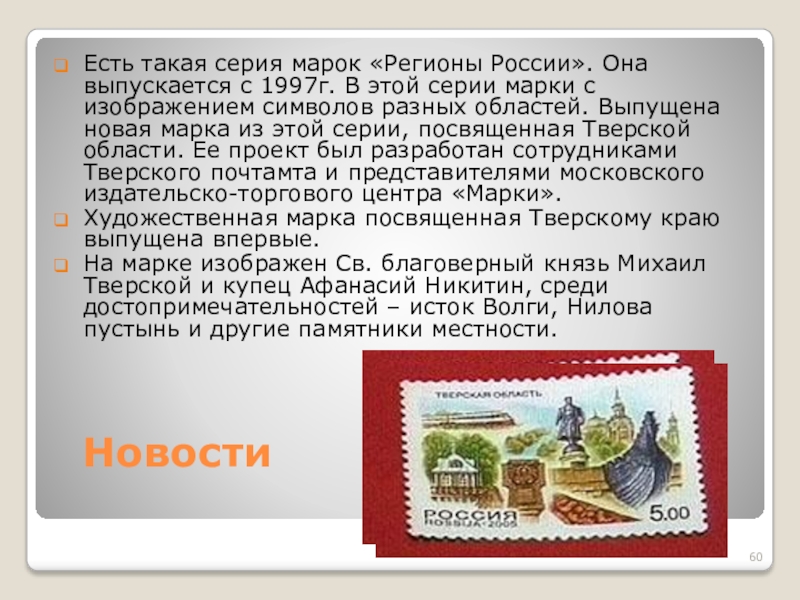 новая марка из этой серии, посвященная Тверской области. Ее проект был разработан сотрудниками Тверского почтамта и представителями московского издательско-торгового центра «Марки».