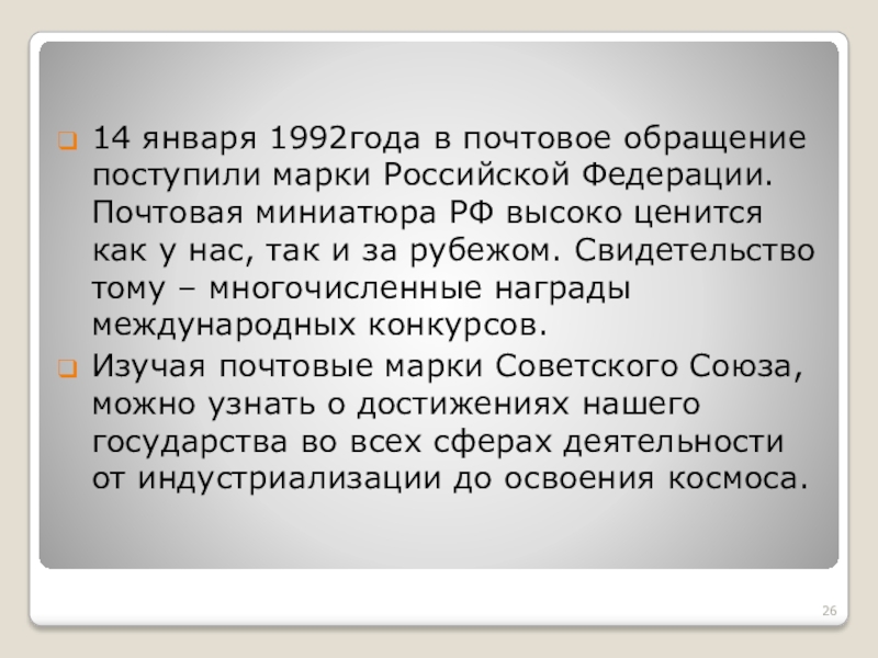 Слайд 2614 января 1992года в почтовое обращение поступили марки Российской Федерации.