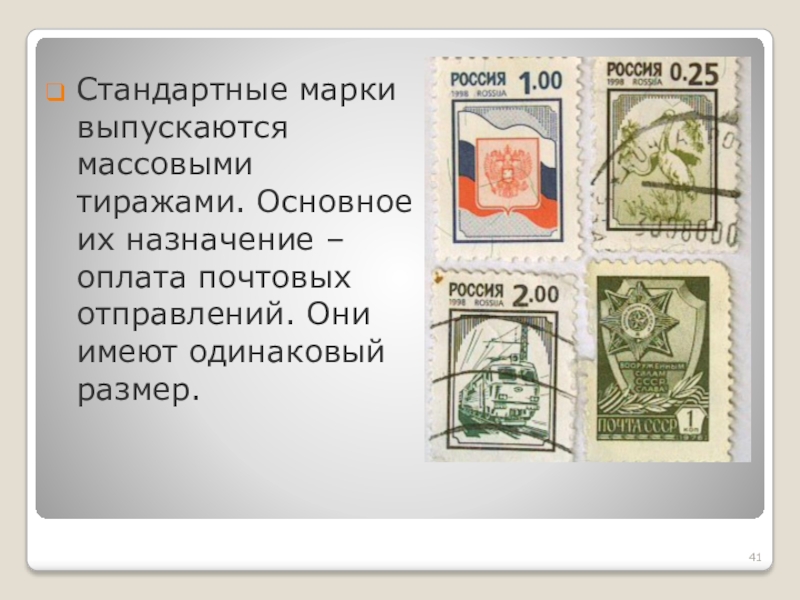 Слайд 41Стандартные марки выпускаются массовыми тиражами. Основное их назначение – оплата
