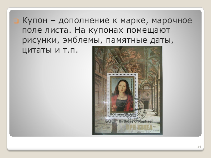 Слайд 54Купон – дополнение к марке, марочное поле листа. На купонах