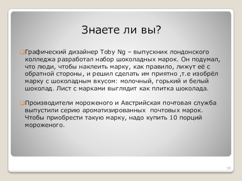 марку, как правило, лижут её с обратной стороны, и решил сделать им приятно ,т.е изобрёл марку с шоколадным вкусом: молочный, горький и белый шоколад. Лист с марками выглядит как плитка шоколада.