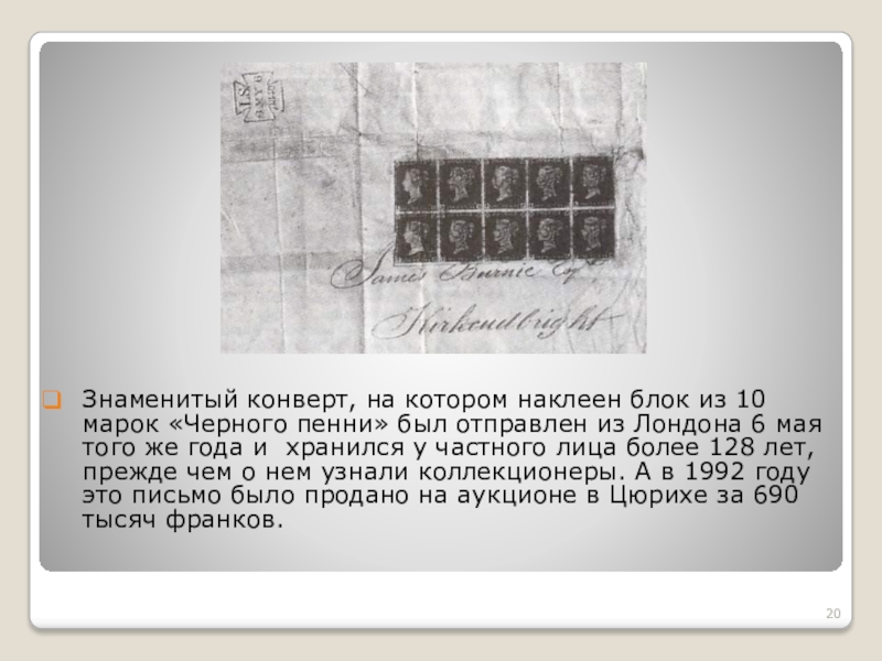 Слайд 20Знаменитый конверт, на котором наклеен блок из 10 марок «Черного