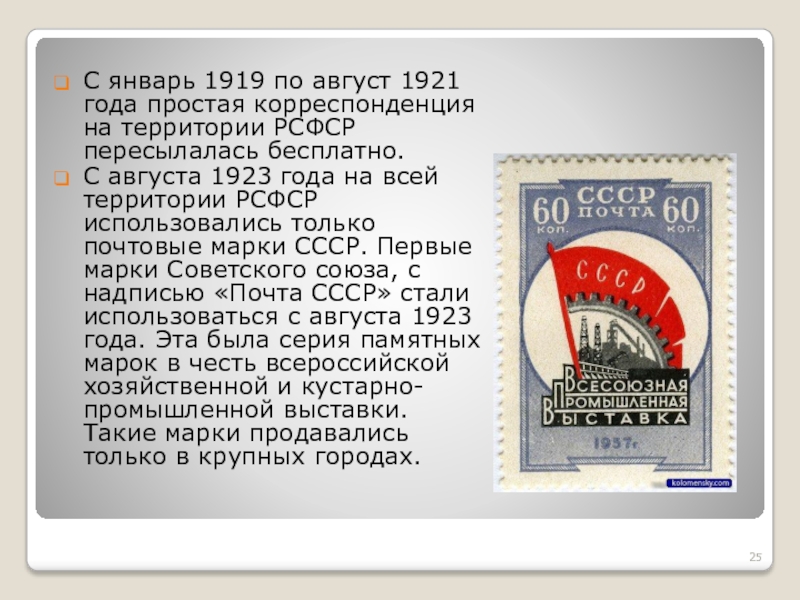 Слайд 25С январь 1919 по август 1921 года простая корреспонденция на