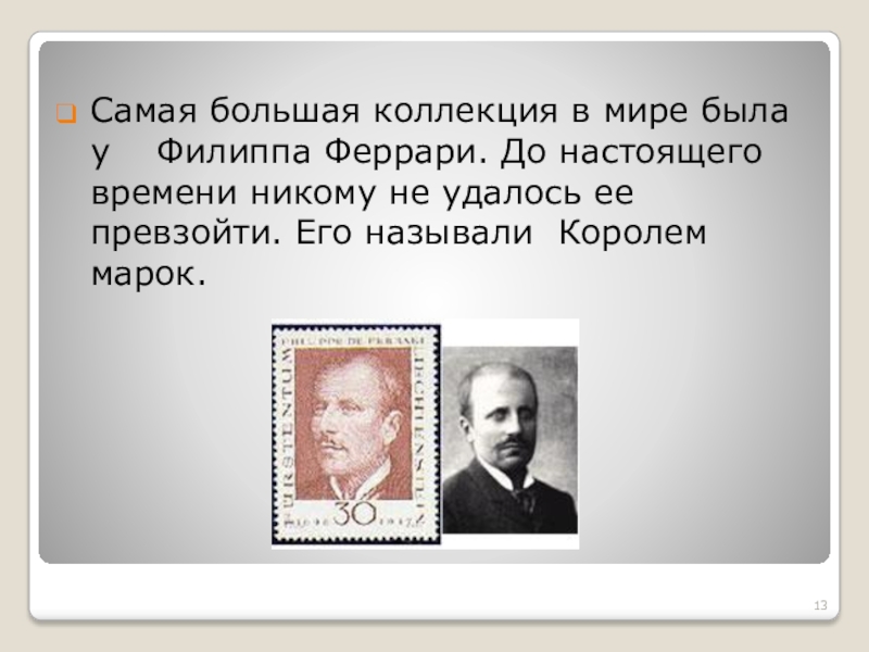 Слайд 13Самая большая коллекция в мире была у Филиппа Феррари.