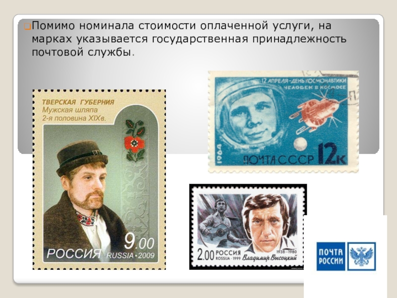 Слайд 17Помимо номинала стоимости оплаченной услуги, на марках указывается государственная принадлежность