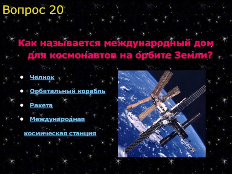 Слайд 42Как называется международный дом для космонавтов на орбите Земли?
