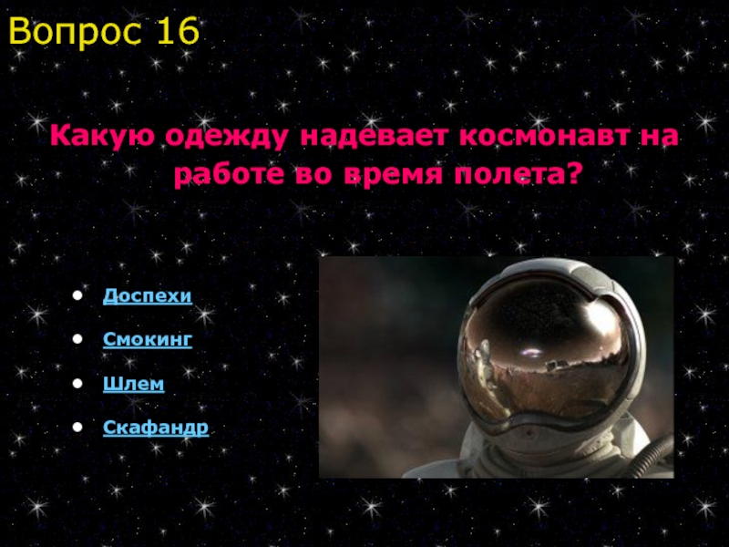 Слайд 34Какую одежду надевает космонавт на работе во время полета?