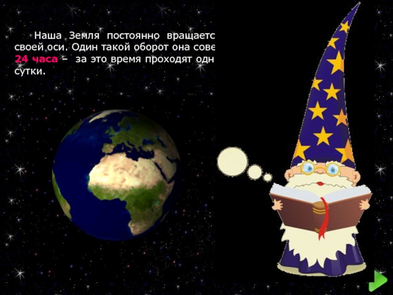 Слайд 5 Наша Земля постоянно вращается вокруг своей оси. Один