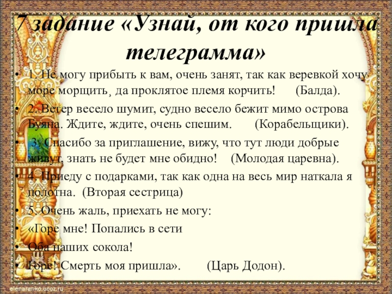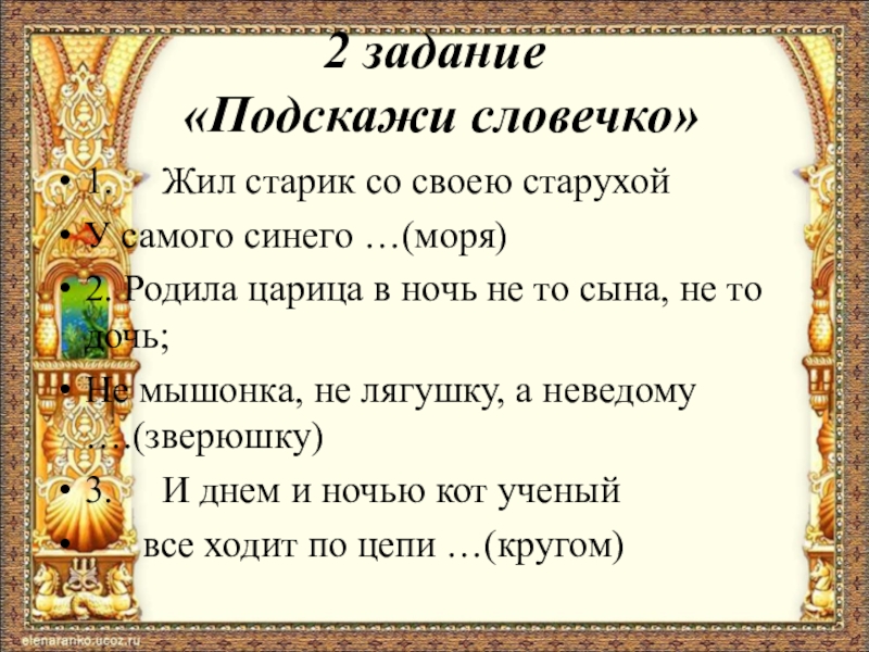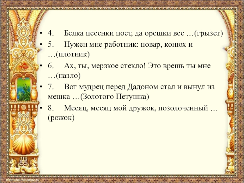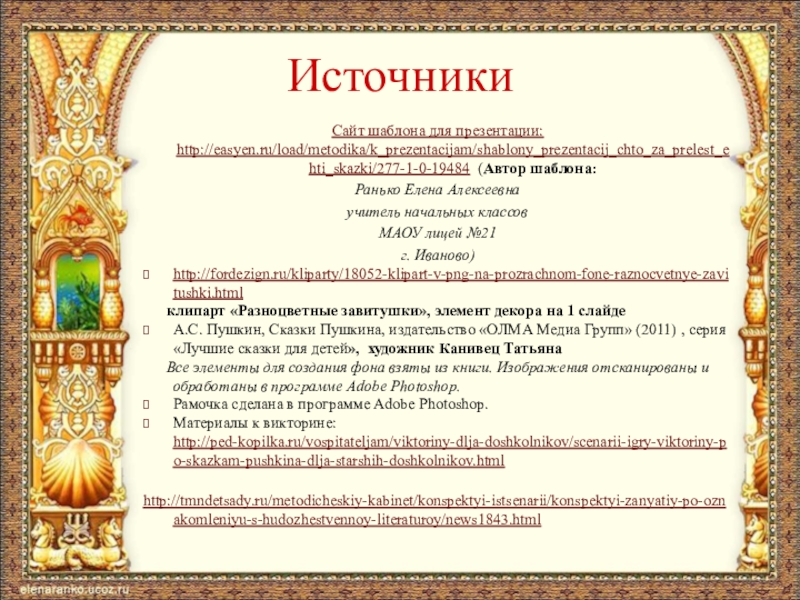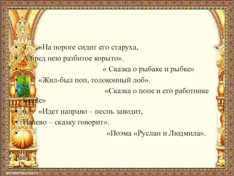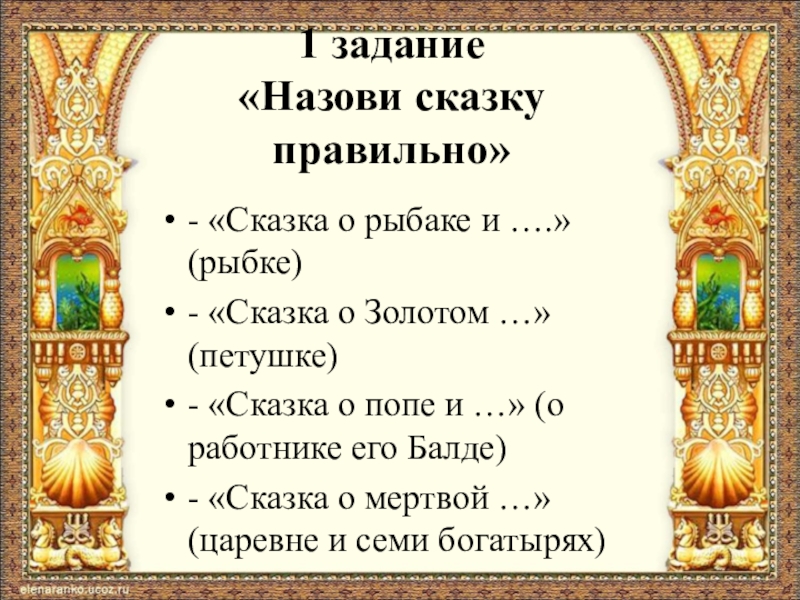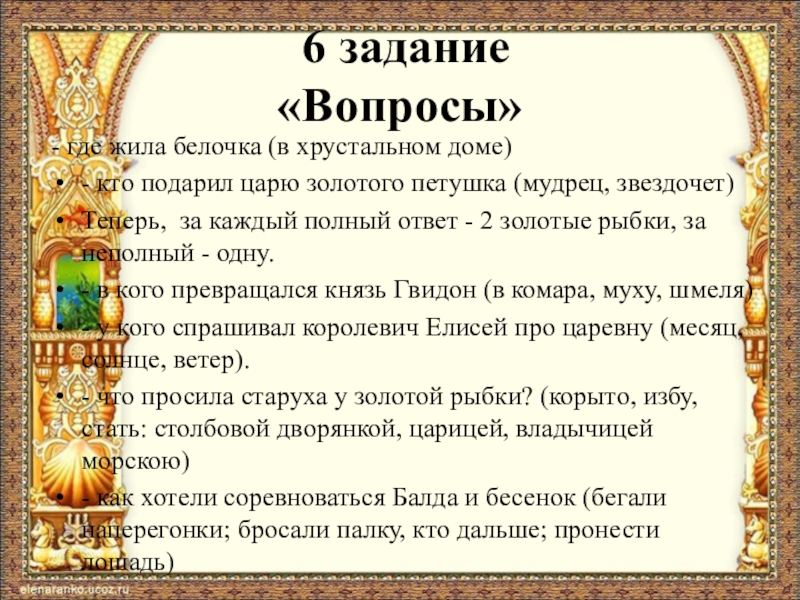 Материалы к викторине: http://ped-kopilka.ru/vospitateljam/viktoriny-dlja-doshkolnikov/scenarii-igry-viktoriny-po-skazkam-pushkina-dlja-starshih-doshkolnikov.html