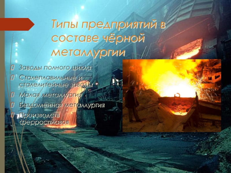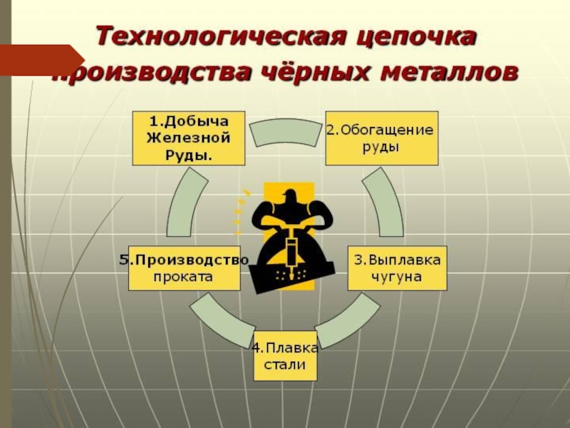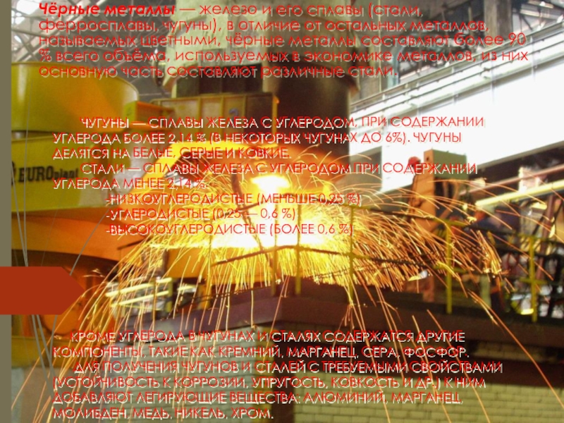 6%). ЧУГУНЫ ДЕЛЯТСЯ НА БЕЛЫЕ, СЕРЫЕ И КОВКИЕ. СТАЛИ — СПЛАВЫ ЖЕЛЕЗА С УГЛЕРОДОМ ПРИ СОДЕРЖАНИИ УГЛЕРОДА МЕНЕЕ 2,14 %. -НИЗКОУГЛЕРОДИСТЫЕ (МЕНЬШЕ 0,25 %) -УГЛЕРОДИСТЫЕ (0,25 — 0,6 %) -ВЫСОКОУГЛЕРОДИСТЫЕ (БОЛЕЕ 0,6 %) КРОМЕ УГЛЕРОДА В ЧУГУНАХ И СТАЛЯХ СОДЕРЖАТСЯ ДРУГИЕ КОМПОНЕНТЫ, ТАКИЕ КАК КРЕМНИЙ, МАРГАНЕЦ, СЕРА, ФОСФОР. ДЛЯ ПОЛУЧЕНИЯ ЧУГУНОВ И СТАЛЕЙ С ТРЕБУЕМЫМИ СВОЙСТВАМИ (УСТОЙЧИВОСТЬ К КОРРОЗИИ, УПРУГОСТЬ, КОВКОСТЬ И ДР.) К НИМ ДОБАВЛЯЮТ ЛЕГИРУЮЩИЕ ВЕЩЕСТВА: АЛЮМИНИЙ, МАРГАНЕЦ, МОЛИБДЕН, МЕДЬ, НИКЕЛЬ, ХРОМ.Чёрные металлы — железо и его сплавы (стали, ферросплавы, чугуны), в отличие от остальных металлов, называемых цветными, чёрные металлы составляют более 90 % всего объёма, используемых в экономике металлов, из них основную часть составляют различные стали.