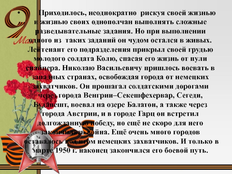 одного из таких заданий он чудом остался в живых. Лейтенант его подразделения прикрыл своей грудью молодого солдата Колю, спасая его жизнь от пули снайпера. Николаю Васильевичу пришлось воевать в западных странах, освобождая города от немецких захватчиков. Он прошагал солдатскими дорогами через города Венгрии–Секешфехервар, Сегеди, Будапешт, воевал на озере Балатон, а также через города Австрии, и в городе Гарц он встретил долгожданную победу, но ещё не скоро для него закончилась война. Ещё очень много городов оставалось под игом немецких захватчиков. И только в марте 1950 г. наконец закончился его боевой путь.
