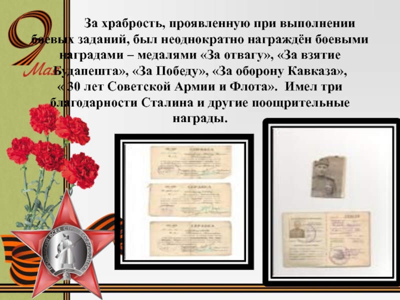 « 30 лет Советской Армии и Флота». Имел три благодарности Сталина и другие поощрительные награды.