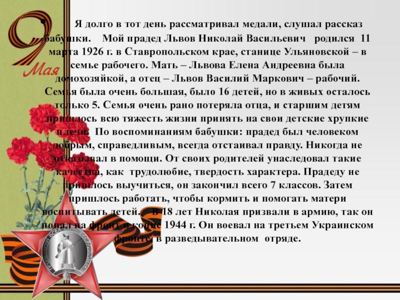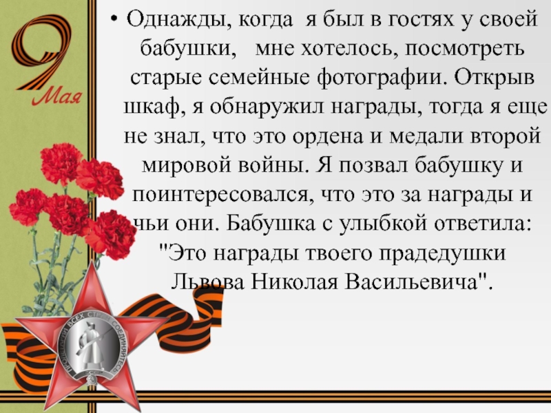 награды, тогда я еще не знал, что это ордена и медали второй мировой войны. Я позвал бабушку и поинтересовался, что это за награды и чьи они. Бабушка с улыбкой ответила: "Это награды твоего прадедушки Львова Николая Васильевича".