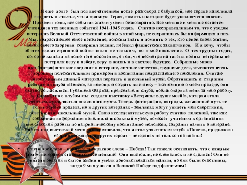 гордость и счастье, что я правнук Героя, память о котором будет увековечена навеки.Проходят годы, все события жизни уходят безвозвратно. Все меньше и меньше остается очевидцев тех военных событий 1941-1945 годов. Считаю несправедливым то, что с уходом ветеранов Великой Отечественной войны в иной мир, не сохранилась бы информация о них. Мы, подрастающее юное поколение, должны знать и помнить о тех, кто ценой своей жизни, ценой своего здоровья совершил подвиг, победил фашистских захватчиков. И я хочу, чтобы об этих героях страшной войны знали не только я, но и моё поколение. О тех трудных годах, которые выпали на долю того поколения, о том, что несмотря на тяготы войны ветераны не потеряли веру в победу, веру в жизнь и в светлое будущее. Собранные мною автобиографические сведения о ветеране, личные качества, трудовые дела, являются очень хорошим положительным примером в воспитании подрастающего поколения. Считаю необходимым данный материал передать в школьный музей. Обратившись к старшим ребятам из клуба «Поиск», за помощью создать выставку – экспозицию о моём прадеде, они охотно согласились. Губашева Фариза, председатель клуба, поблагодарила меня за мою работу. Совместно с клубом мы создали выставку «Ветераны в душе моей!», которая стала неотъемлемой частью школьного музея. Теперь фотографии, награды, жизненный путь не только моего прадеда, но и других ветеранах - земляках могут увидеть мои сверстники, посетив наш школьный музей. Свою исследовательскую работу считаю полезной, так как собранная информация пополнила школьный музей, поможет учителям в организации внеклассной работы по патриотическому воспитанию молодежи, сохранит память о ветеране. Работа над выставкой меня так вдохновила, что я стал участником клуба «Поиск», продолжаю сбор информации о других героях – ветеранах не только той войны!