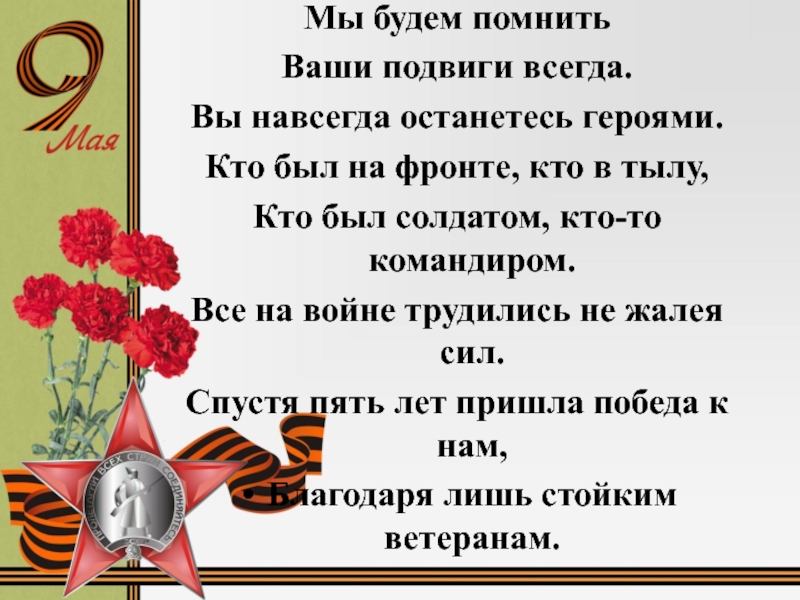 Страшное слово – война, и прекрасное слово – Победа! Так тяжело осознавать, что с каждым годом ветеранов становится все меньше! Они выстояли, не сломались и не сдались! Они не видели богатой и сытой жизни и умели довольствоваться малым, но они были счастливы, когда 9 мая узнали о Великой Победе над фашизмом!
