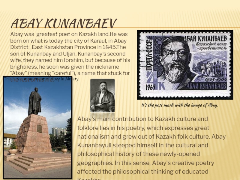 Abay was greatest poet on Kazakh land.He was born on what is today the city of Karaul, in Abay District , East Kazakhstan Province in 1845.The son of Kunanbay and Uljan, Kunanbay's second wife, they named him Ibrahim, but because of his brightness, he soon was given the nickname "Abay" (meaning "careful"), a name that stuck for the rest of his life.