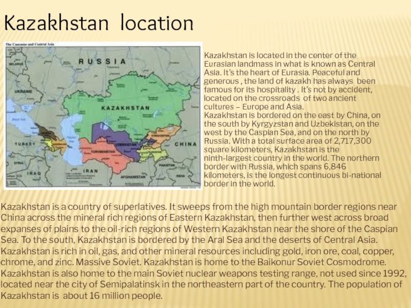 Kazakhstan is a country of superlatives. It sweeps from the high mountain border regions near China across the mineral rich regions of Eastern Kazakhstan, then further west across broad expanses of plains to the oil-rich regions of Western Kazakhstan near the shore of the Caspian Sea. To the south, Kazakhstan is bordered by the Aral Sea and the deserts of Central Asia. Kazakhstan is rich in oil, gas, and other mineral resources including gold, iron ore, coal, copper, chrome, and zinc. Massive Soviet. Kazakhstan is home to the Baikonur Soviet Cosmodrome. Kazakhstan is also home to the main Soviet nuclear weapons testing range, not used since 1992, located near the city of Semipalatinsk in the northeastern part of the country. The population of Kazakhstan is about 16 million people.