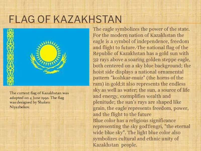 The current flag of Kazakhstan was adopted on 4 June 1992. The flag was designed by Shaken Niyazbekov.