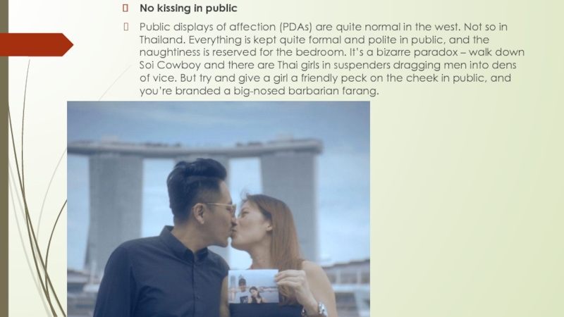No kissing in publicPublic displays of affection (PDAs) are quite normal in the west. Not so in