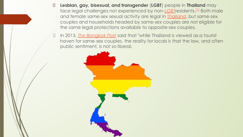 Слайд 6Lesbian, gay, bisexual, and transgender (LGBT) people in Thailand may face legal challenges