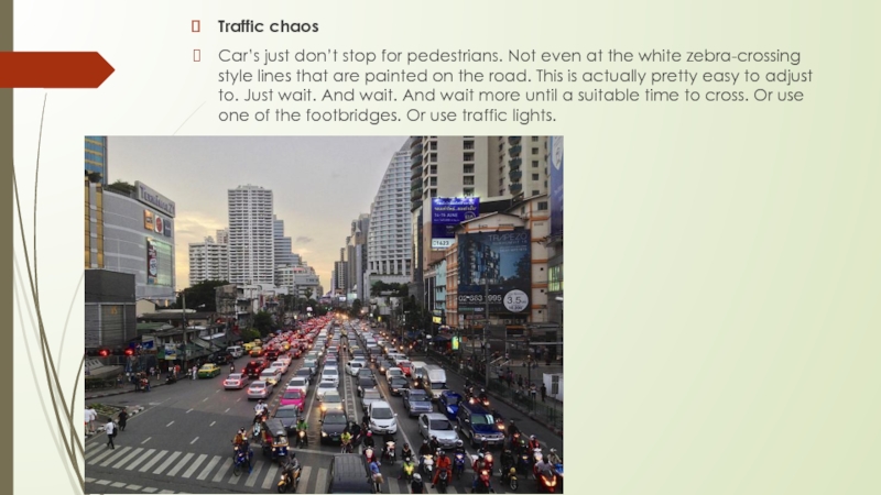 Traffic chaosCar’s just don’t stop for pedestrians. Not even at the white zebra-crossing style lines that are painted on the road. This is actually pretty easy to adjust to. Just wait. And