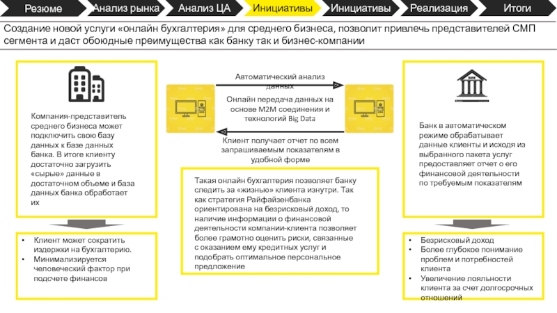 Такая онлайн бухгалтерия позволяет банку следить за «жизнью» клиента изнутри. Так как стратегия Райфайзенбанка ориентирована на безрисковый доход, то наличие информации о финансовой деятельности компании-клиента позволяет более грамотно оценить риски, связанные с оказанием ему кредитных услуг и подобрать оптимальное персональное предложение