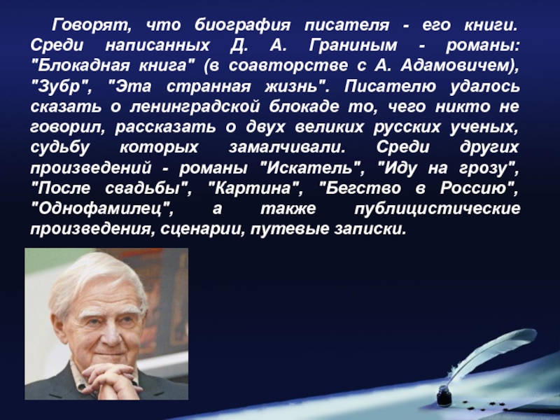 Слайд 3Даниил Александрович Гранин — русский прозаик, киносценарист и публицист, один