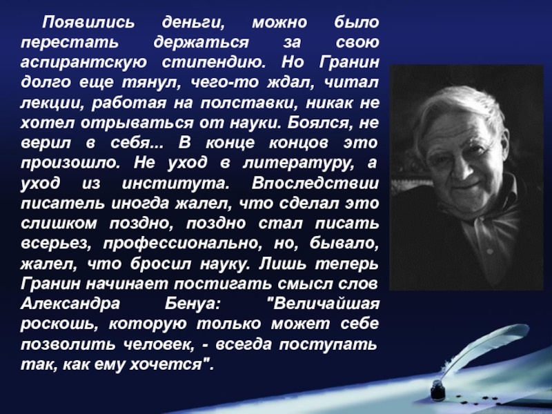 на полставки, никак не хотел отрываться от науки. Боялся, не верил в себя... В конце концов это произошло. Не уход в литературу, а уход из института. Впоследствии писатель иногда жалел, что сделал это слишком поздно, поздно стал писать всерьез, профессионально, но, бывало, жалел, что бросил науку. Лишь теперь Гранин начинает постигать смысл слов Александра Бенуа: "Величайшая роскошь, которую только может себе позволить человек, - всегда поступать так, как ему хочется".
