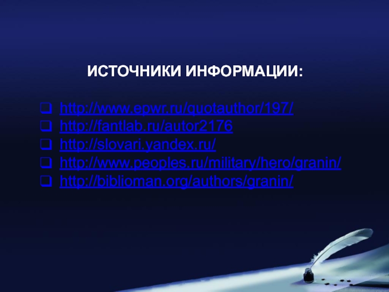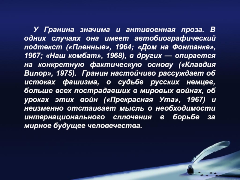 Слайд 12У Гранина значима и антивоенная проза. В одних случаях она