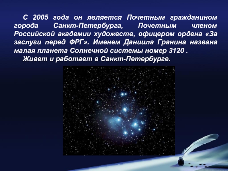 Именем Даниила Гранина названа малая планета Солнечной системы номер 3120 .