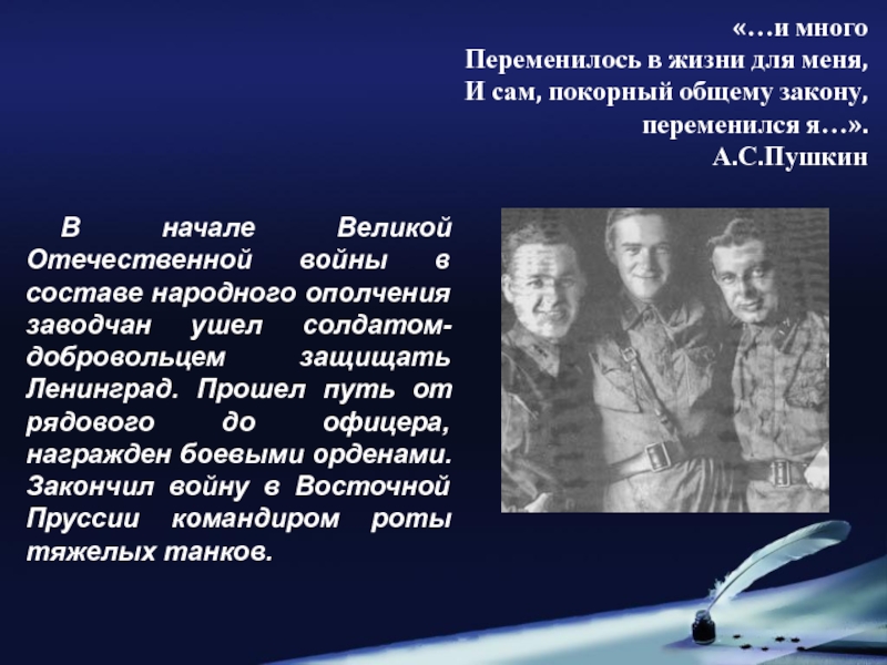 ушел солдатом-добровольцем защищать Ленинград. Прошел путь от рядового до офицера,
